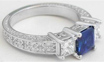 Gemstone: Natural Blue Sapphire Engraved Styling Princess Cut Blue Sapphire and Princess Cut Diamond Ring