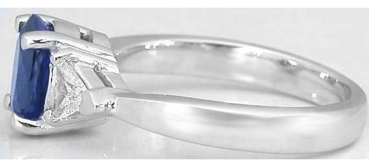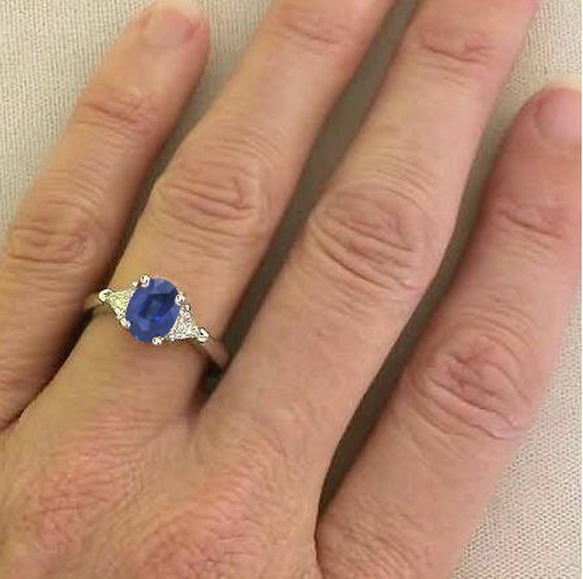 Special Features: This elegant design features a gorgeous royal  blue sapphire and large sparkling trillion diamond side stones. The sapphire is cut into a oval shape and the size of the diamonds balances the look perfectly. The color of the sapphire is a rich royal navy blue and when you see the ring in natural daylight, you will be mesmerized by its beauty. The color really comes alive.  The sapphire and diamonds are eye clean and the contrast between the intense color of the sapphire and the bright white diamonds is quite striking. These fine stones are set into a 14k white gold mounting that is very comfortable on the finger.  This exceptional ring is a classic, for the lady who is looking for a non-traditional engagement ring, we know that you will be proud to have this truly special ring on your finger.