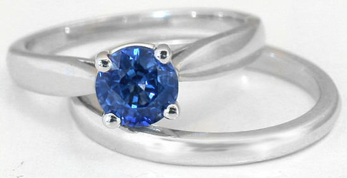 Special Features: Simple, elegant and still very eye catching, this solitaire ring features a bright and lively blue sapphire. The sapphire is better than eye clean and is definitely a dazzling focal point to this classic solitaire ring style. When you have a ring with a gorgeous stone, you don't need a lot going on to get noticed!  A modern twist on a traditional diamond solitaire, this ring is just as beautiful and worthy of that special place on her finger. This ring is also very comfortable and will definitely stand up to a lifetime of wear. The matching band is a perfect complement and sits flush against the sapphire ring.