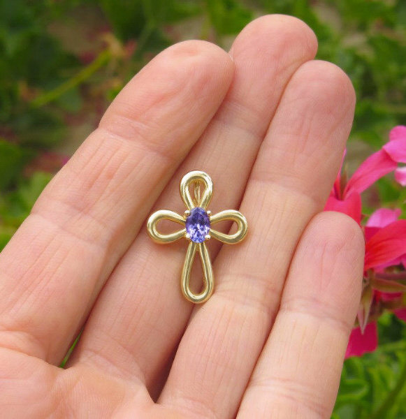 Yellow Gold Real Genuine Tanzanite Cross Pendant gift idea