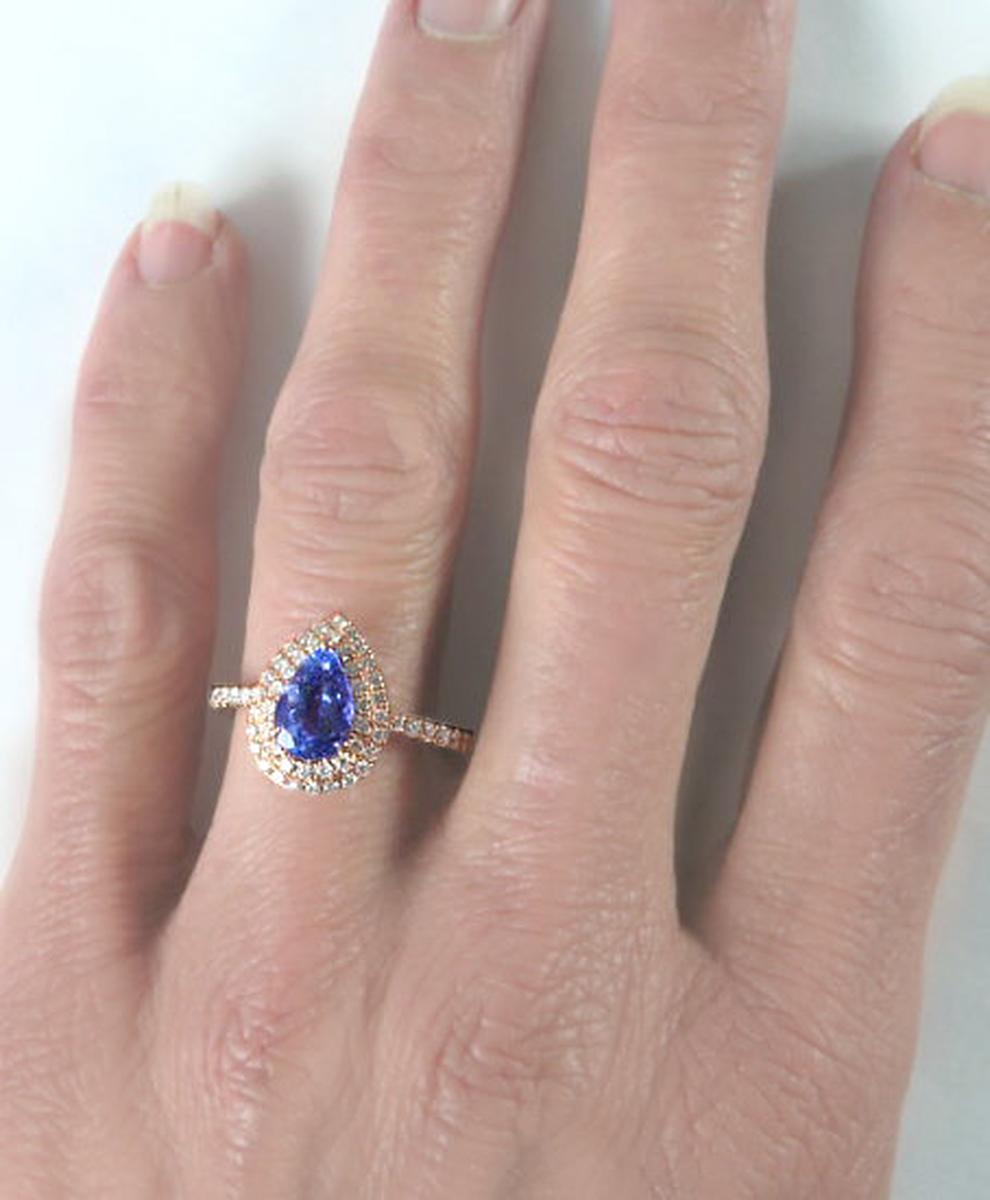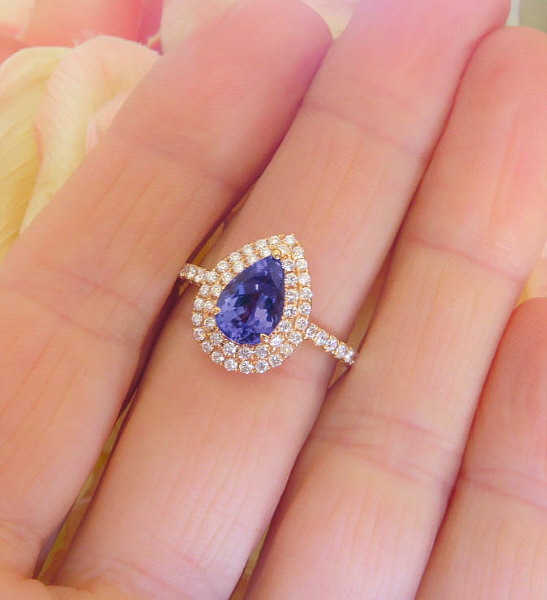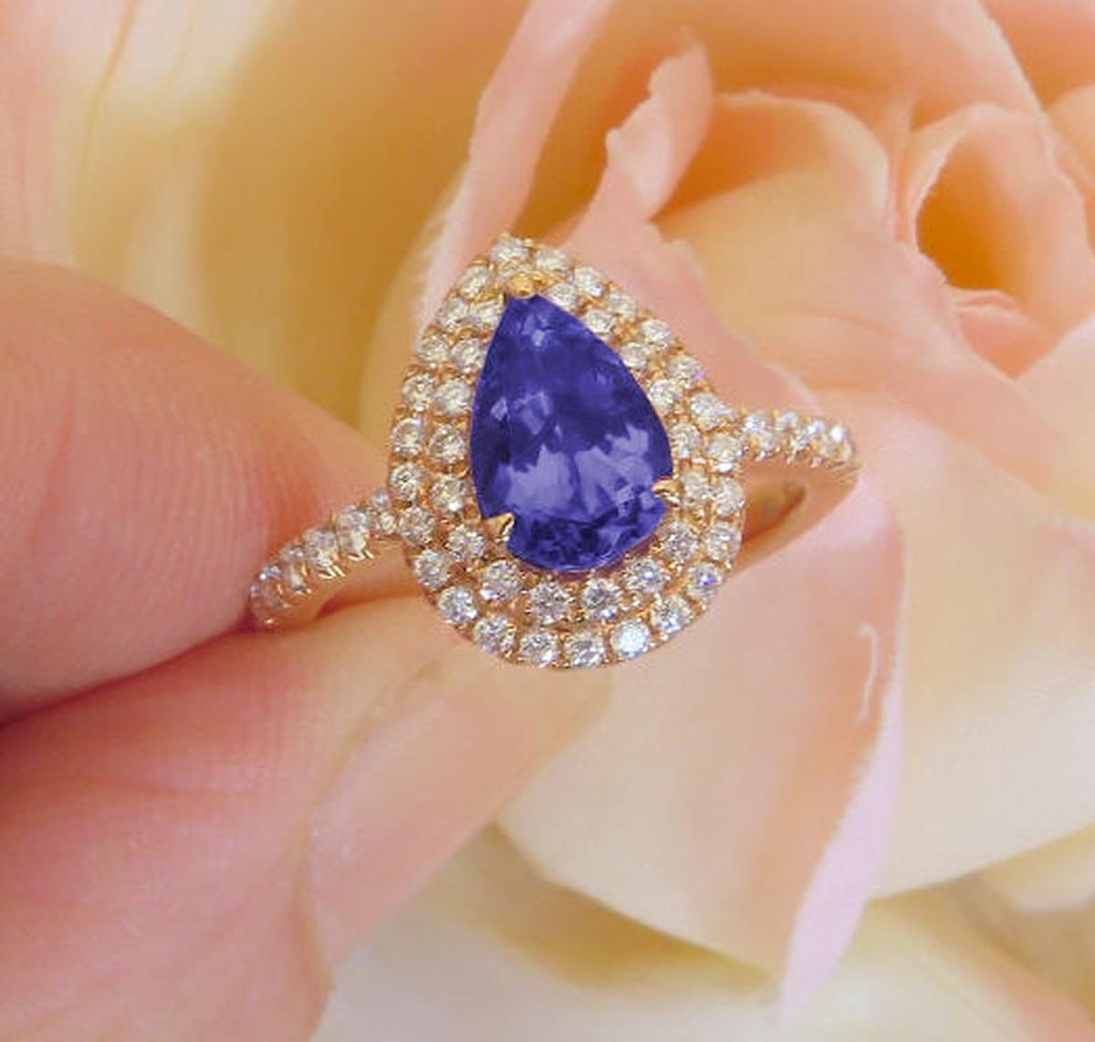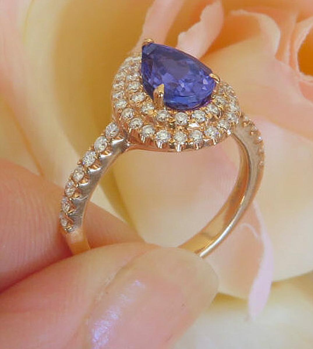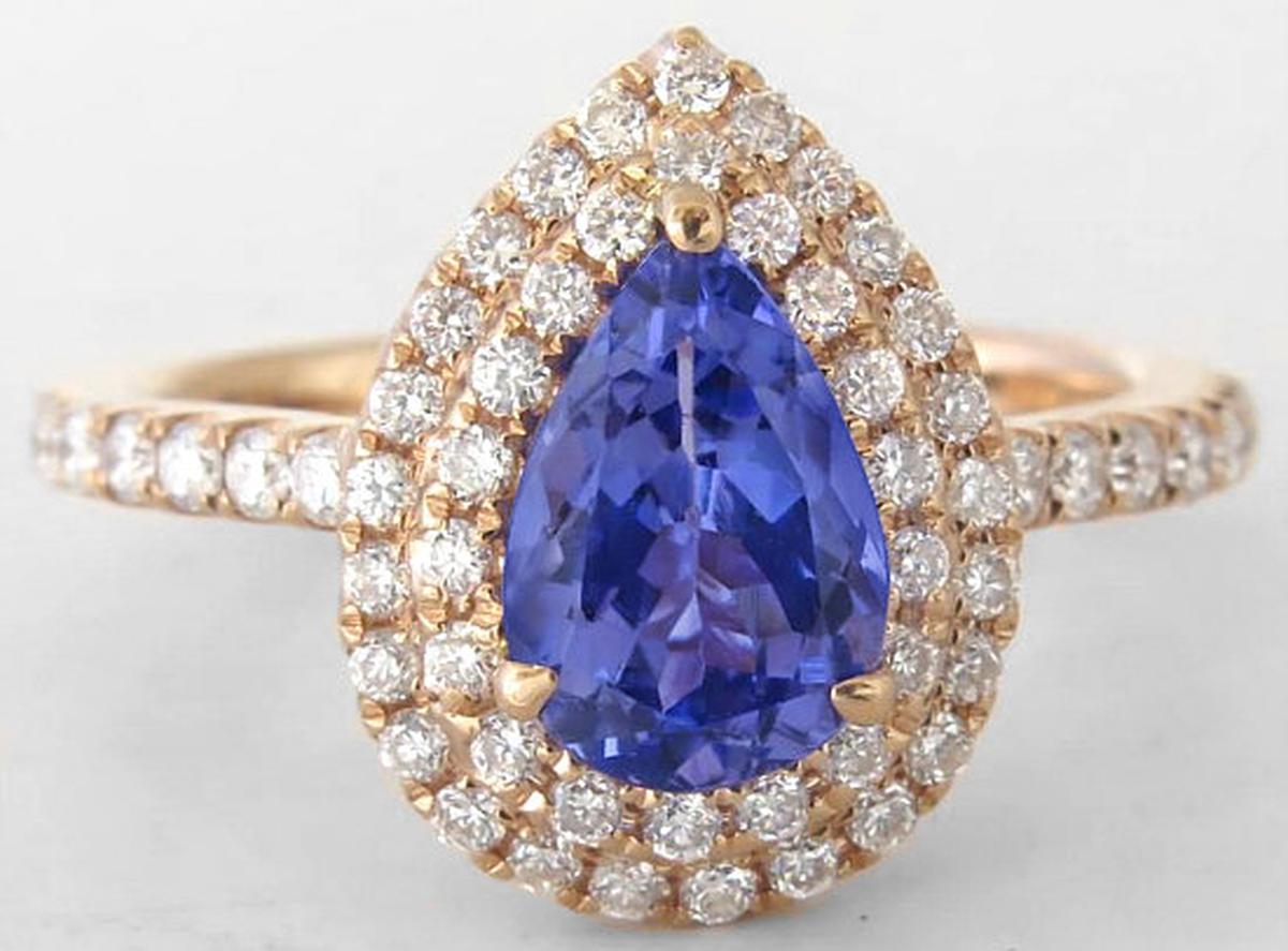 Natural Large Pear Cut Tanzanite Ring in 18k Rose Gold for sale   Large Pear Cut Tanzanite Ring in 18k Rose Gold with a Double Diamond Halo   Real Pear Tanzanite Ring in 18k Rose Gold with a Double Diamond Halo