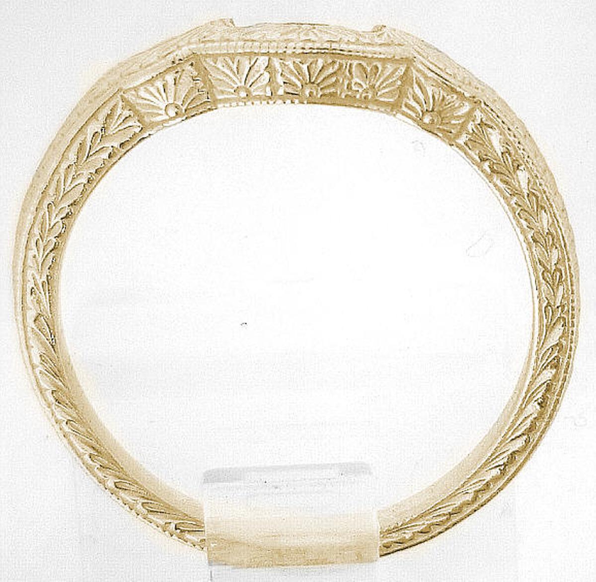 The optional matching band is contoured to sit flush against the main ring and is engraved to match. If you are purchasing this as an engagement ring, we strongly recommend that the ring and band be purchased at the same time in order to assure the best fit between the two rings. If the band is purchased later, you may need to send the main ring back to us so the band can be adjusted to fit.