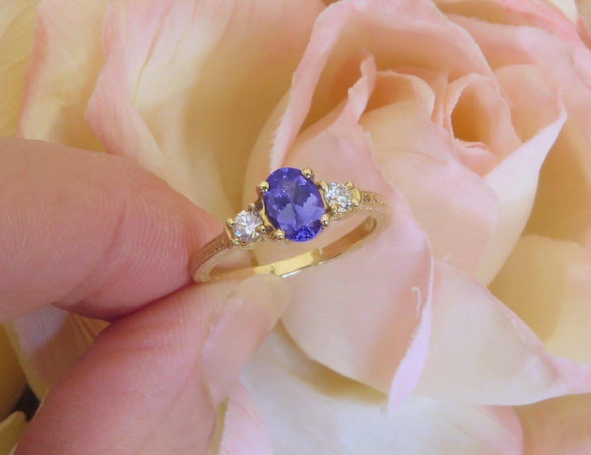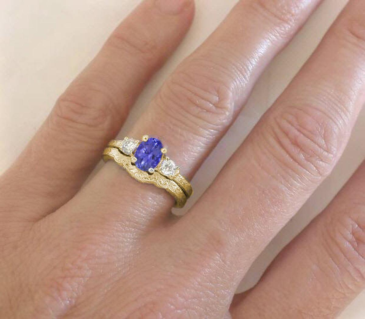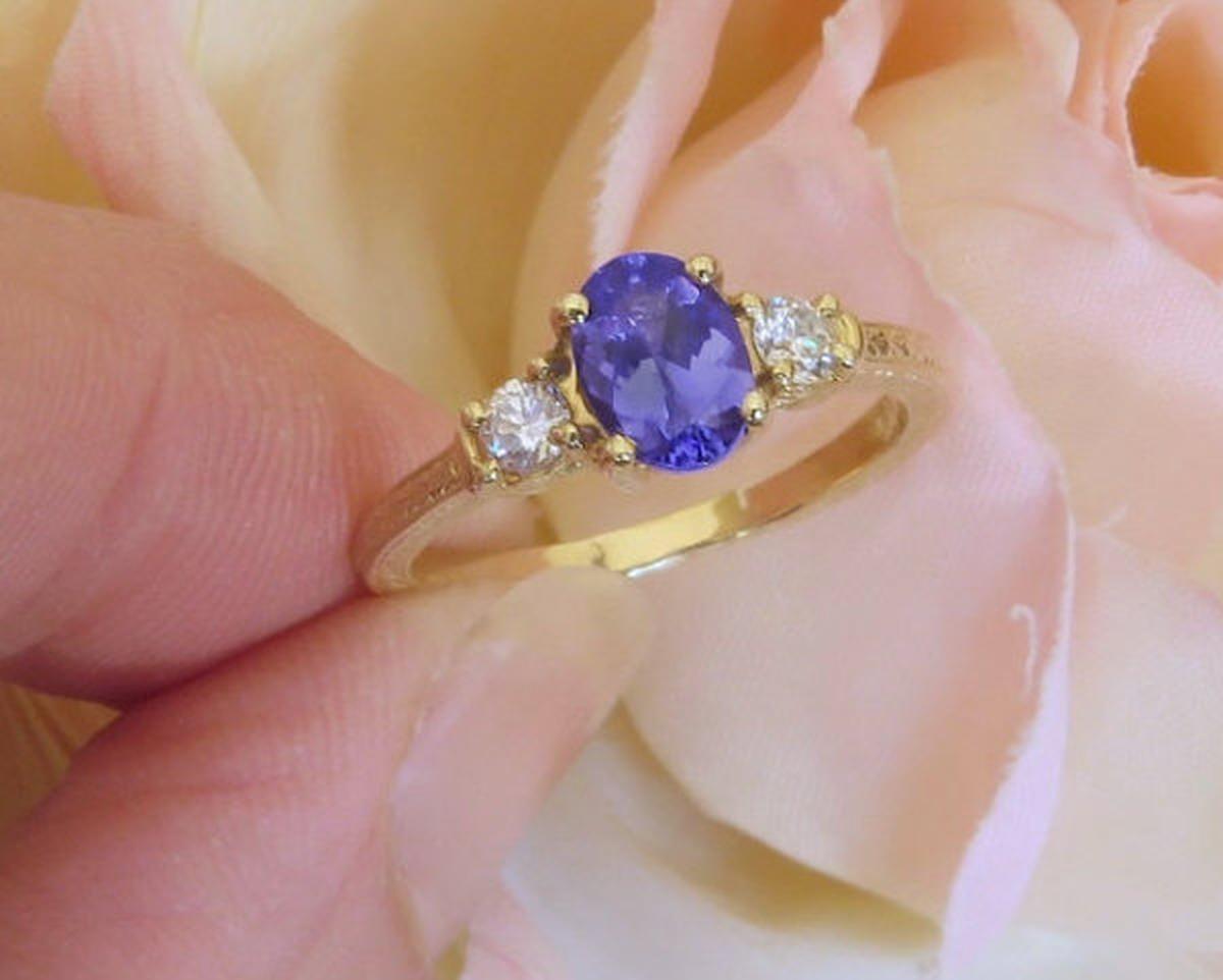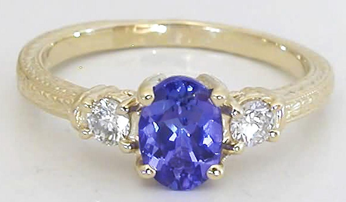 3 Stone Oval Natural Tanzanite and Round Diamond Engagement Ring in 14k yellow gold carved band   3 Stone Oval Tanzanite Engagement Rings in 14k yellow gold