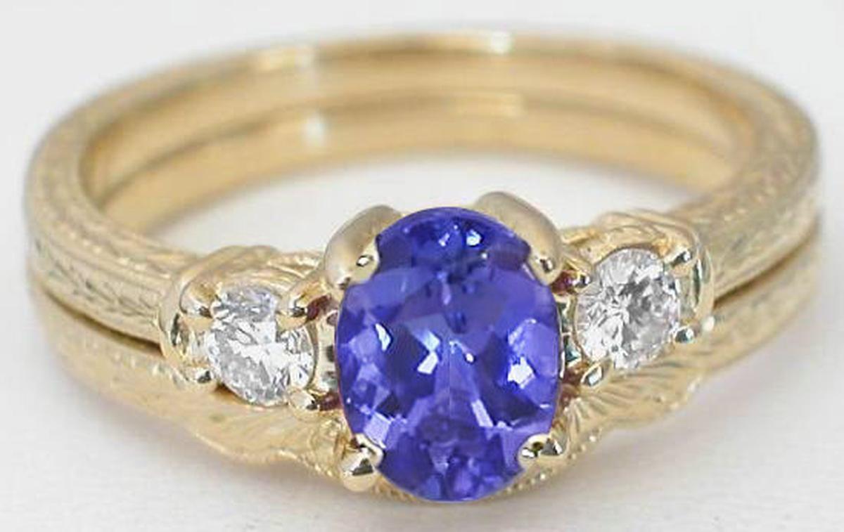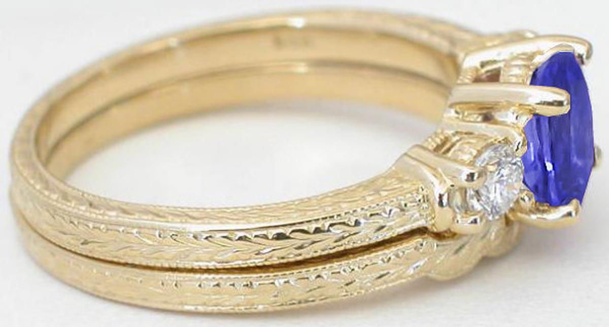 Vintage Design Natural Oval Tanzanite Round Diamond Engagement Ring in 14k yellow gold for sale   Past Present Future Oval Tanzanite Round Diamond Engagement Ring Set in 14k yellow gold