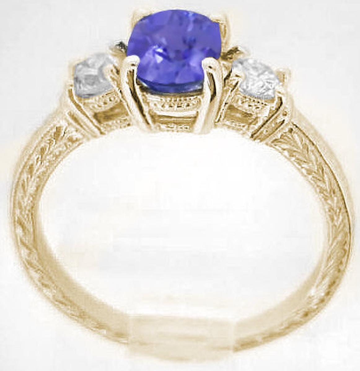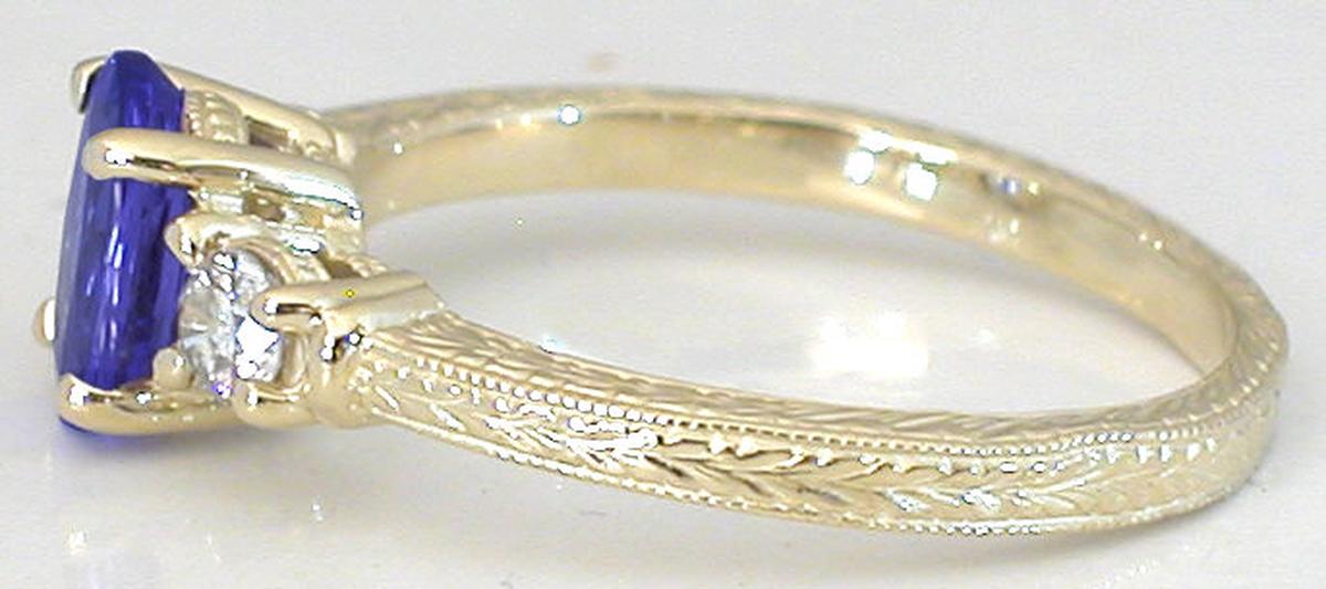 Special Features:A MJS Original Design: Past-present-future, or three-stone, rings are classics that will always be a wonderful and elegant. But with this original MJS design, we've turned a classic up a notch by engraving the tanzanite ring on all three sides with beautiful Woodstock's feet and flowers. The tanzanite at the center measures 7x5mm and is equivalent in size to a 1 carat diamond.  It has a beautiful bluish-purple color, is very nicely cut and is eye clean. Beautiful fine quality, eye clean, round diamonds accent each side and add a tasteful touch of sparkle to the design.