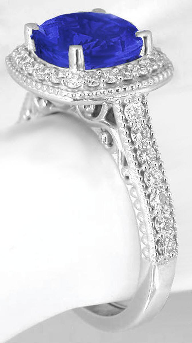 Special Features: Only at MJS!  A gorgeous eye catching center stone with the perfect touch of diamonds and unique filigree detailing on the band. The AAA grade tanzanite we have selected for this ring is so beautiful. It has the perfect color, a wonderful combination of blues and purples, and it is beautifully faceted with brilliant style facets on the pavilion (bottom). Fine quality gemstones always look amazing on their own, but we think that a touch of diamonds can often make them look even better and that is true for this particular design. The tanzanite itself has plenty of sparkle which is only enhanced by the fine quality diamond halo that surrounds it.  A few more diamonds adorn the top of the band as well. The sides of the band are finished with beaded detail. And last, but not least, the filigree scroll detail on the undergallery assures that this ring will look amazing from every angle.