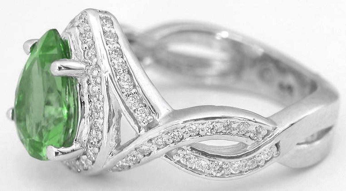 Special Features: What an incredible birthstone or engagement ring this would make! From the elegance of the design to the unique center stone, this is one ring that you will cherish and be proud to show off. The seafoam tourmaline 2.15 carats and has a beautiful medium apple olive green color. The tourmaline is better than eye clean and it has a superb cut. The setting we have selected showcases this one of a kind gem perfectly. Small full cut round diamonds surround the tourmaline and continue around the basket and down the woven band. The band follows the flowing lines around the tourmaline into a double crossover design. The diamonds are eye clean and add just the right dose of brilliance and shine to the ring. While we find this ring to be quite striking, it is understated and quietly elegant too.