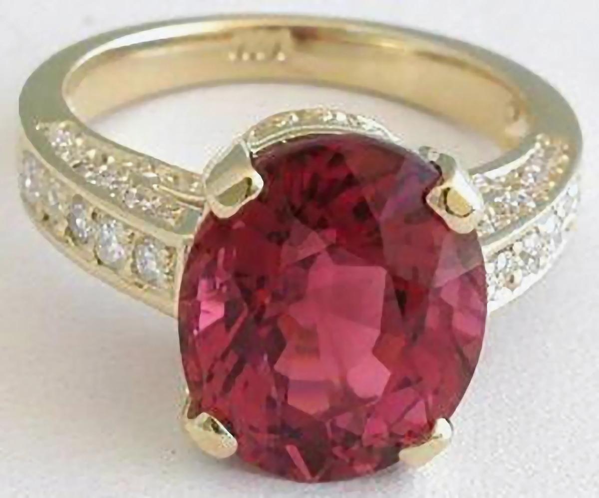 bead set diamonds. The tourmaline is eye clean, over 5 carats in size and is a very special stone. With the pink raspberry color, this dreamy stone commands