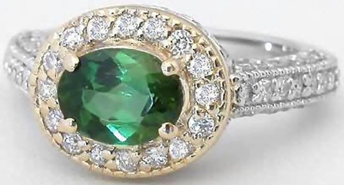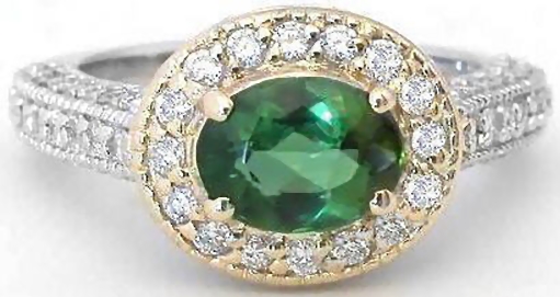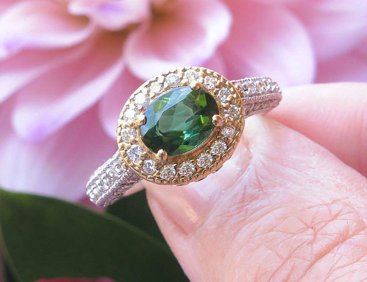 East West Natural Green Tourmaline and Diamond Halo Ring in two tone 14k white and yellow gold for sale    Natural Green Tourmaline Engagement Rng with a real Diamond Halo in 14k white and yellow gold