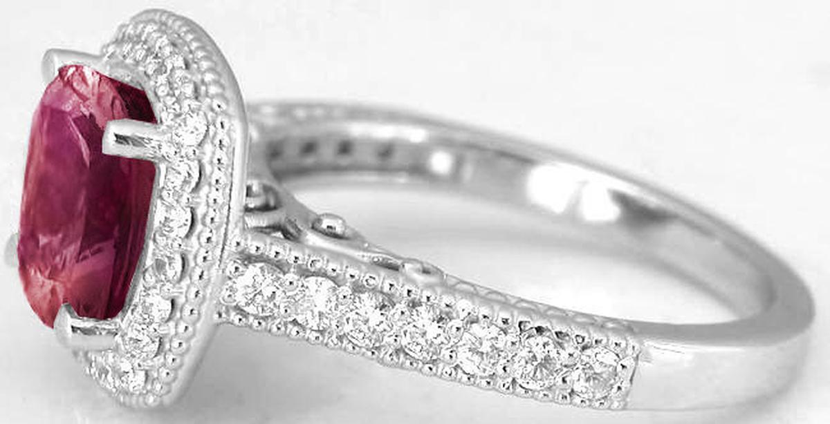 Special Features: Only at MJS!  A beautiful center stone complemented by the perfect touch of diamonds and unique filigree detailing on the band. The pink tourmaline featured in this design is 8mm, at 2.4 carats.  The tourmaline is very well cut, eye clean and has a gorgeous berry-rose hue. The fine quality gem is quite lively and is enhanced by the near colorless, better than eye clean diamonds that surround it.  Notice the ornate and intricate detail on the band and the undergallery. This is a ring that you will find yourself admiring all the time. The beaded edging and filigree scroll detail give the ring a certain vintage appeal. From the fine quality gemstones in this ring to the unique and elegant setting, this is one ring that you will be proud to wear.
