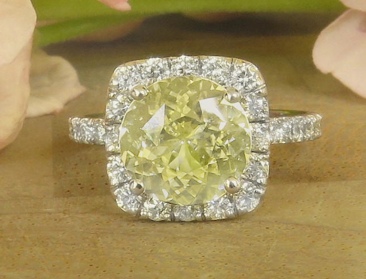 yellow diamond. Framing this dazzling sapphire is a stunning cushion-shaped