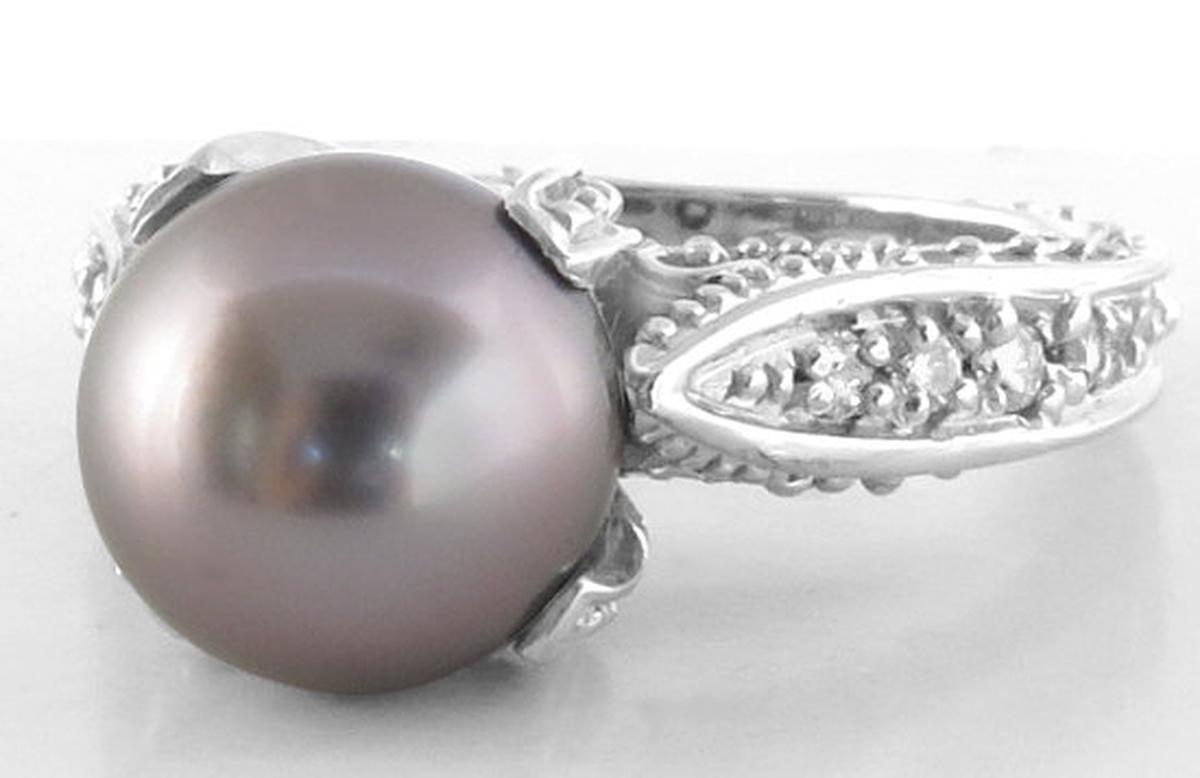 10mm Genuine Tahitian Pearl and Real Diamond Ring in 14k white gold    Unique Silver Tahitian Pearl Rings in 14k white gold