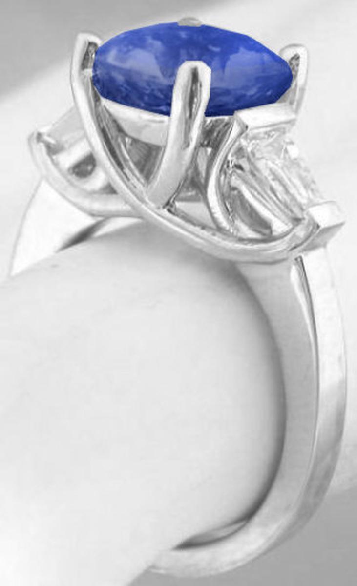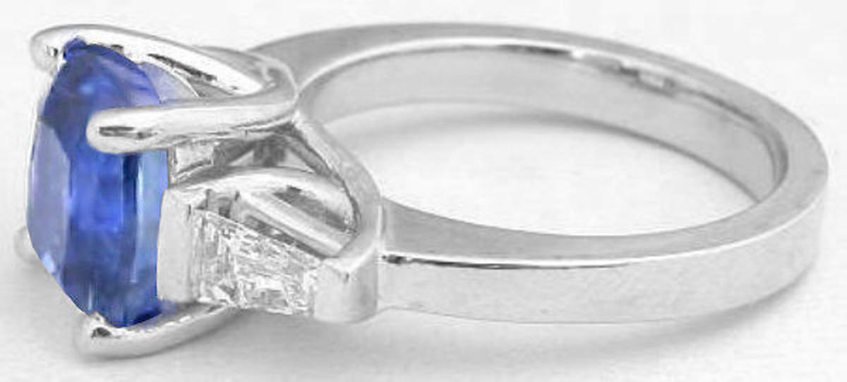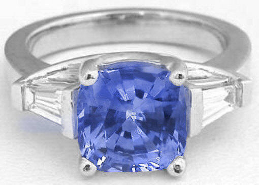 Special Features: This dramatic 3 stone engagement ring design features a spectacular combination of a large cushion cut sapphire and tapered baguette diamonds. The sapphire is a notable size at 3.65 carats and is completely natural and unheated, a rarity for larger size sapphires. The antique cushion cut is also very difficult to find making this a truly one of a kind gem.  The sapphire was mined in Sri Lanka (formerly known as Ceylon) and is just breathtaking. It is vibrant and lively and has a perfect medium tone, beautiful cornflower blue color. It is one of those gems that looks amazing in bright light and dim light so you will be proud to wear it and show it off! The sapphire is set in a Lucida style past, present and future mounting with a single, fine quality, tapered baguette diamond on each side. This symbolic design is classic and timeless and is an ideal choice for an engagement ring.
