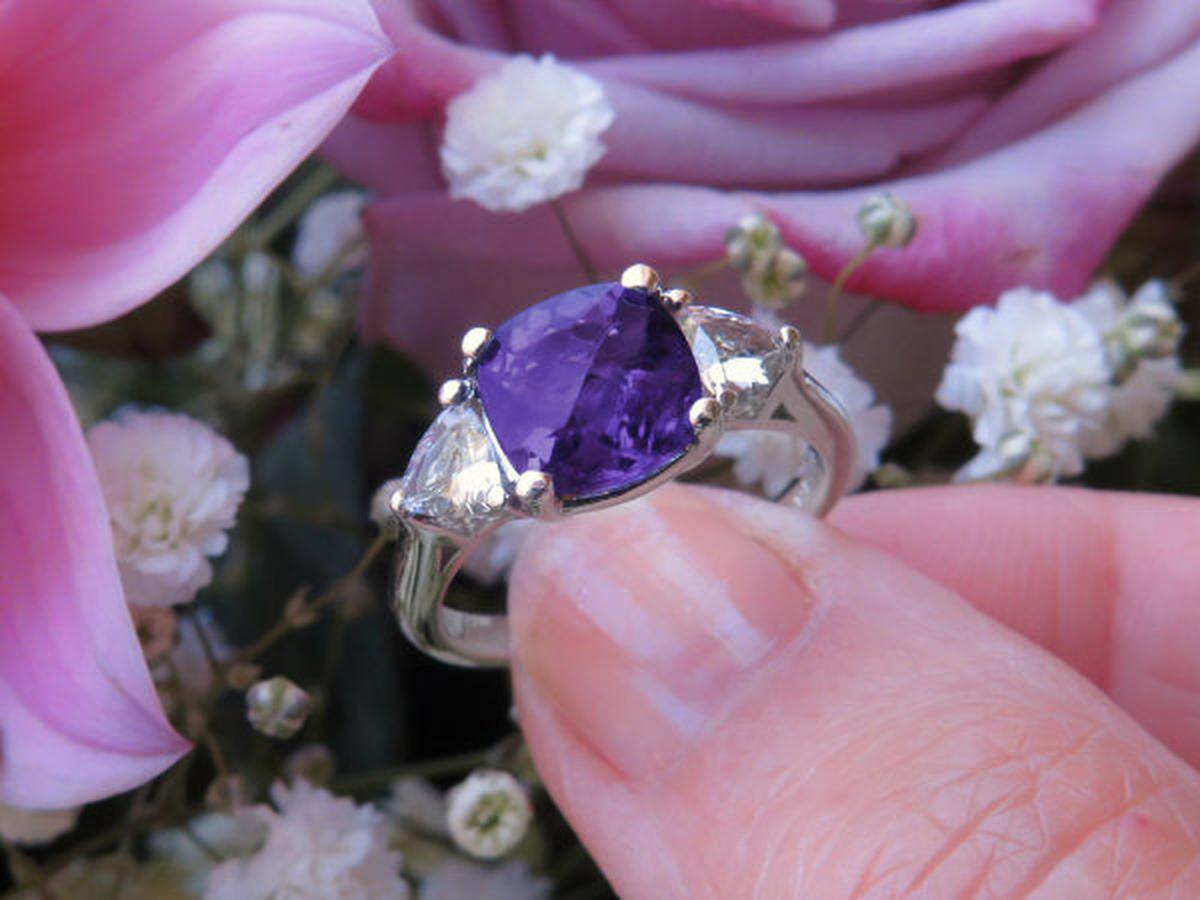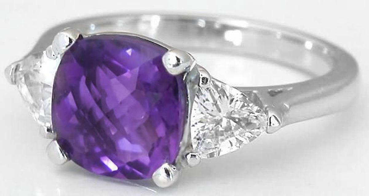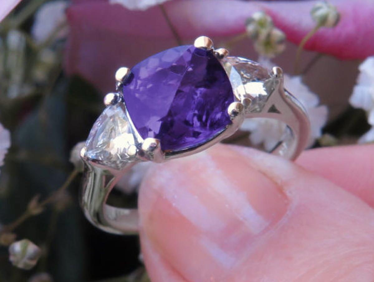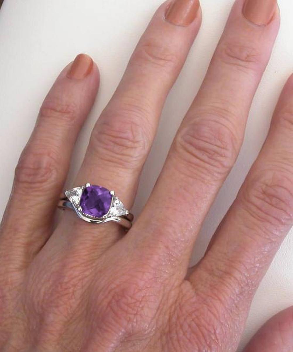 Special Features: A MJS Original Design:  Past-present-future, or three-stone, rings are classics that will always be an elegant choice.  And this special design is no exception. What sets this one apart from the diamond versions you have seen is the gorgeous 8mm cushion cut checkerboard faceted amethyst we have set in the center. The amethyst has a rich royal purple color with beautiful flashes of pinkish purple. We were careful not to choose one that is too dark, nor one that is too light. This one is just right.  The amethyst is very well cut and eye clean. We have set a trillion white sapphire on each side which tastefully balances the design beautifully. The white sapphires also have a very similar look to diamonds for a fraction of the cost. The optional matching band is contoured to sit close against the amethyst ring.