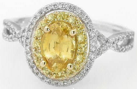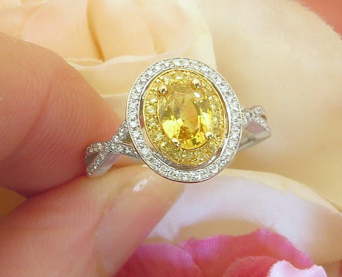 Special Features: This beautiful ring has the look and flair of a custom design. The yellow sapphires are all set in 14k yellow gold. This complements with wonderful sunshine yellow color of the oval sapphire and the tiny round sapphires enhance the overall presence of the center stone. And the diamonds offer a striking contrast to the lovely yellow sapphires. The sapphires are clean and full of sparkle. The delicate band has crossover styling for a nicely balanced design. And even though the diamonds are tiny and micropave set, they are big on impact, shine and sparkle. We just love this new design and think it has the look of a much more expensive custom ring.
