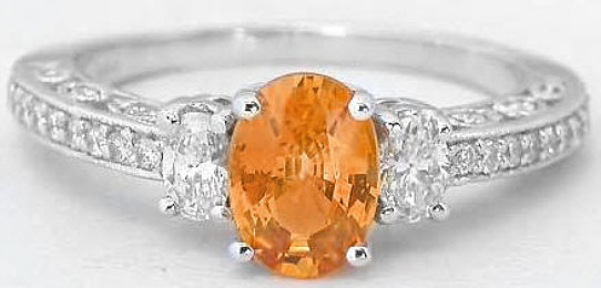 Special Features: For those of you who love antique styled jewelry, this elegant ring is a perfect choice. The gorgeous color of the orange sapphire just dazzles next to the large oval diamonds.  The ring has beautiful antique styling with milgrain edging and bead set diamonds. This ring would make a perfect engagement ring since we also have a matching band available. Or, what a delicate feminine piece for the right hand.  Truly a classic to be cherished for a lifetime.