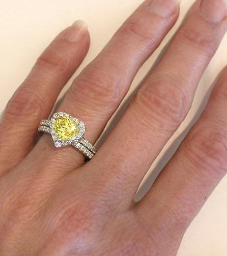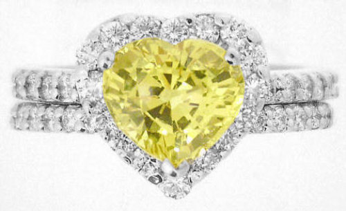 Special Features:Hearts and romance.  The elegant yellow sapphire in this ring looks like a fine yellow sapphire diamond. The sparkle and brilliance from the stone is inviting. The sapphire is surrounded by fine quality diamonds which also extend down the shank.  The sapphire is raised up slightly so the matching diamond band sits underneath. Although the sapphire sits higher than the band, the setting overall is somewhat flat, so the sapphire is protected and will not get in the way of daily activities.  This ring will be the perfect choice for the collector of heart jewelry, or for the lady who's looking for a colorful alternative to the traditional engagement ring. The romance and femininity of this wonderful set will ensure that this will become one of your favorites.