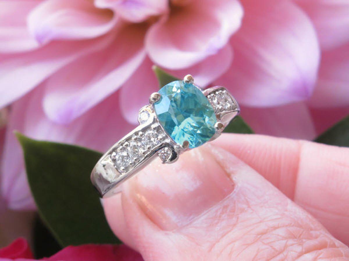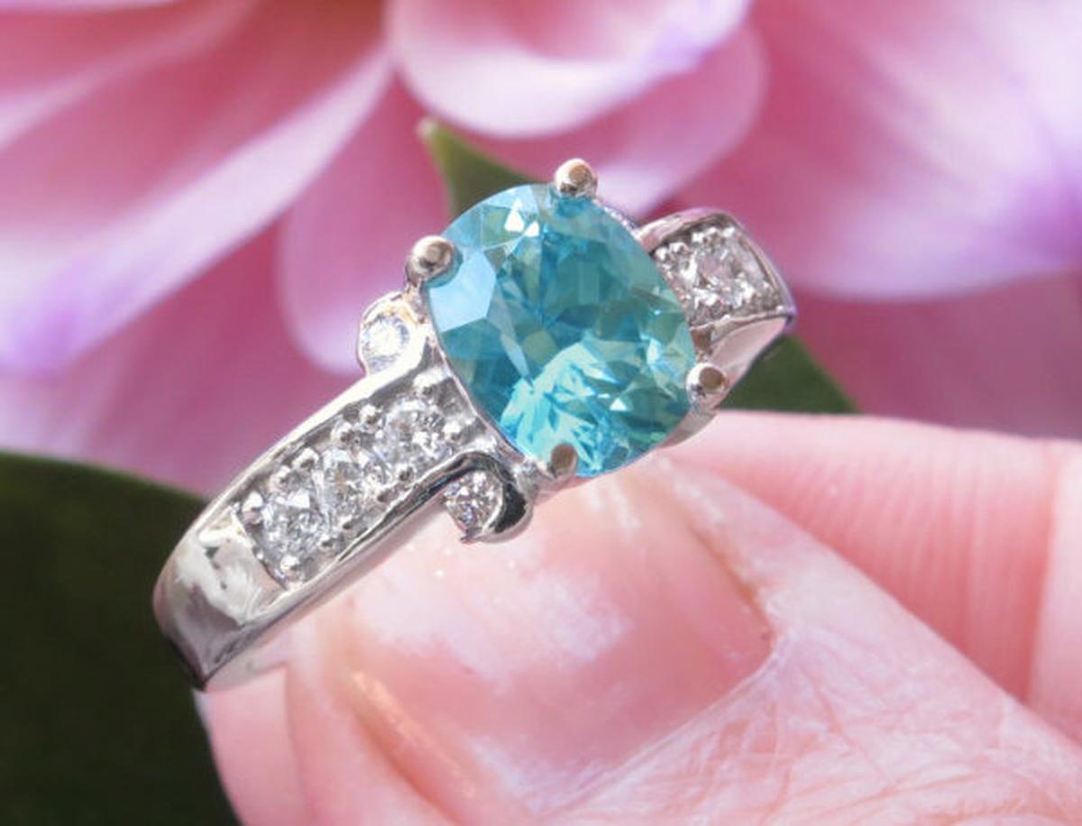 Special Features: This beautiful blue zircon looks like a blue diamond and has an incredible intense color. It has an exquisite cut that brings out the brilliance of the gem even more.  Zircon is the second most refractive gem, next to diamond.  The bead set white diamonds accentuate the beautiful color of this blue zircon. This ring is sure be a treasured ring for many years to come.