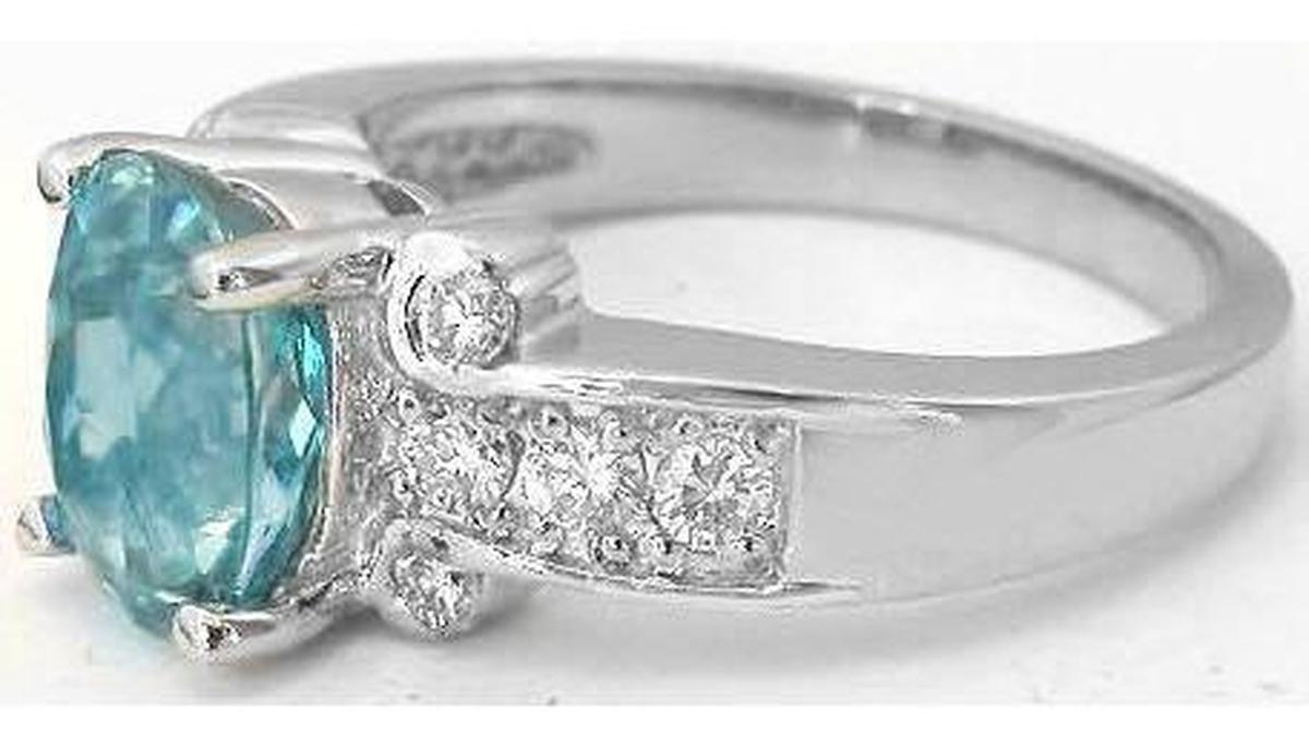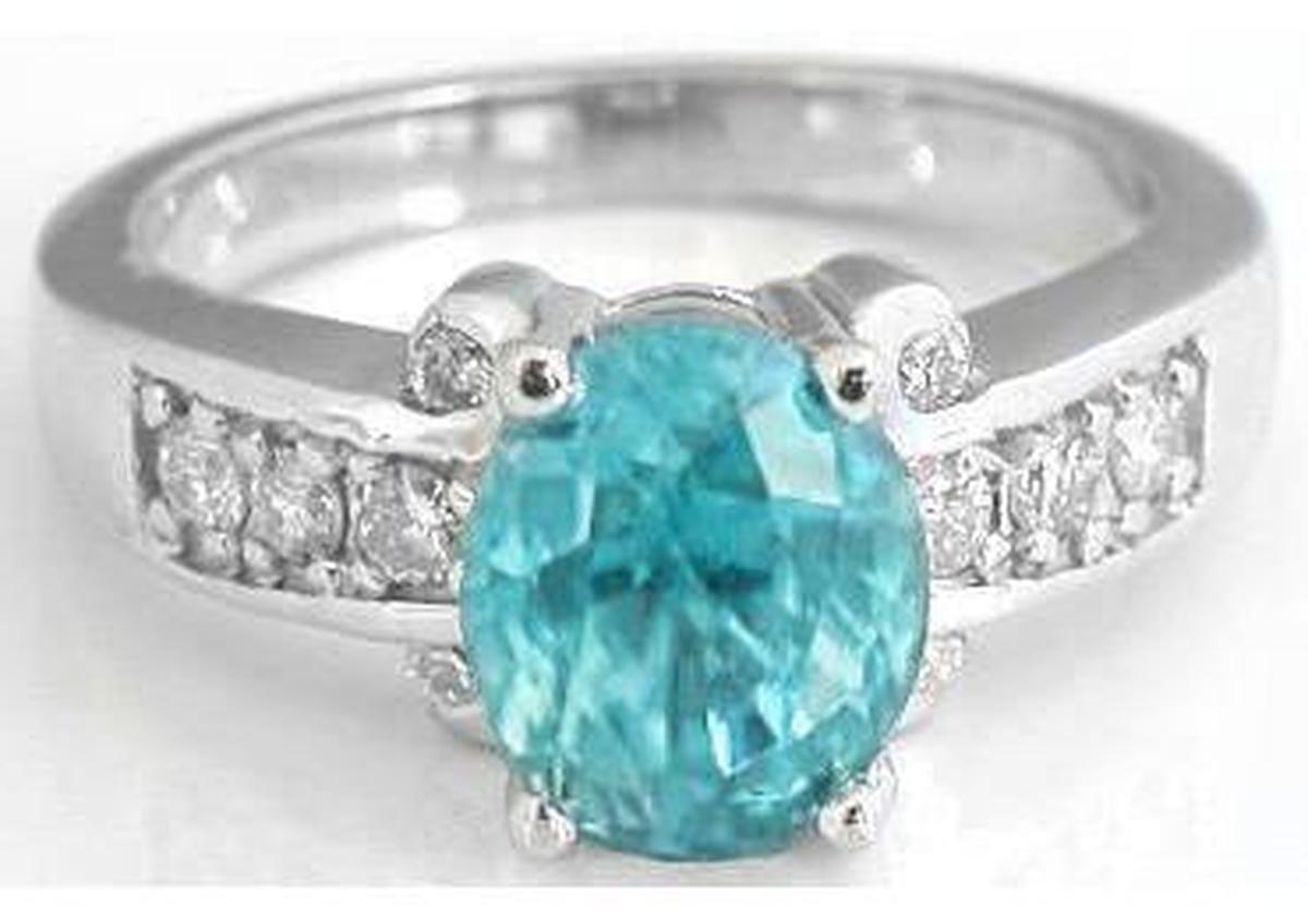 Gemstone: Natural Blue Zircon White Gold Blue Zircon Ring with Real Diamonds in solid 14k white gold