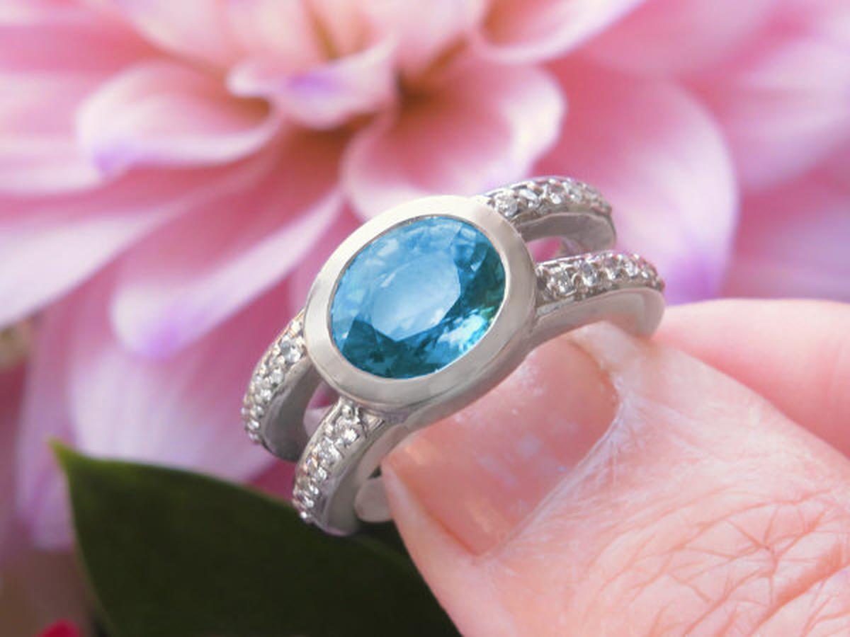 Special Features: Bold and glorious. Fun and fashionable. This large, 9x7mm oval blue zircon is set east-west and surrounded by a thick bezel of 14k white gold for dimension and protection. The icy color of the white gold plays beautifully around the sparkling blue zircon.  The shank is split in two channels on either side and diamonds adorn each channel. The band is thick yet comfortable and will easily stand up to frequent wear. This ring was made to be one of your favorites!
